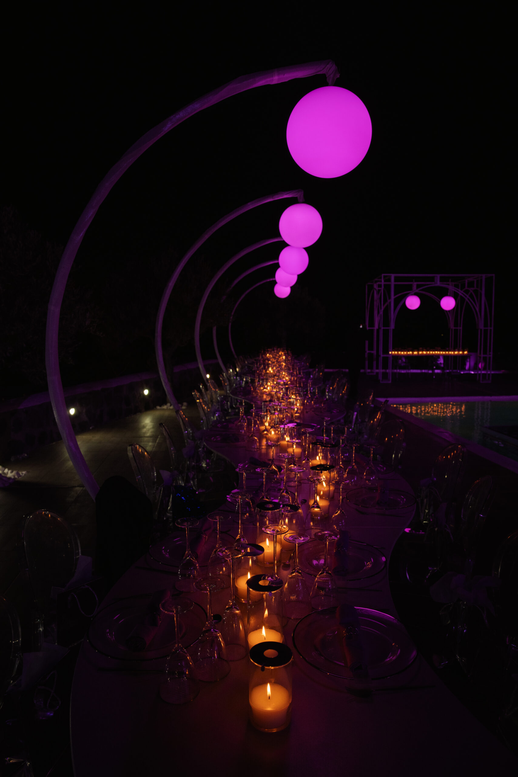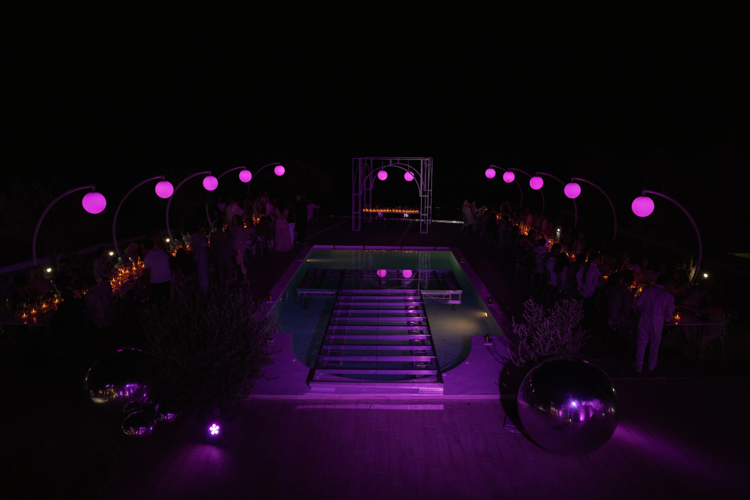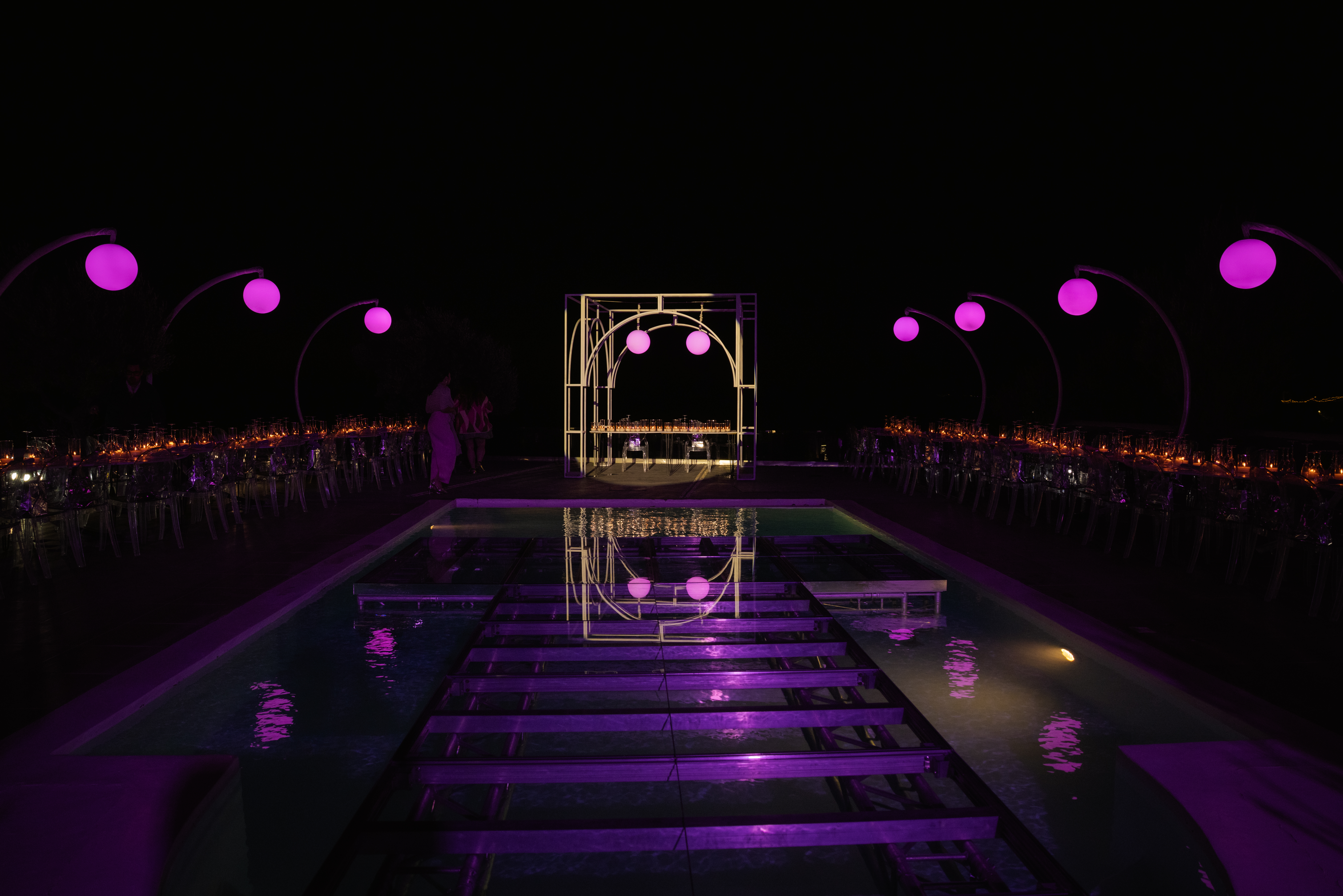 This styled setup featured an elegant dinner by the pool, complemented by a beautifully designed bridge crossing the water. Crescent stands with glowing moon elements added a celestial touch, creating a dreamy and refined evening atmosphere.
