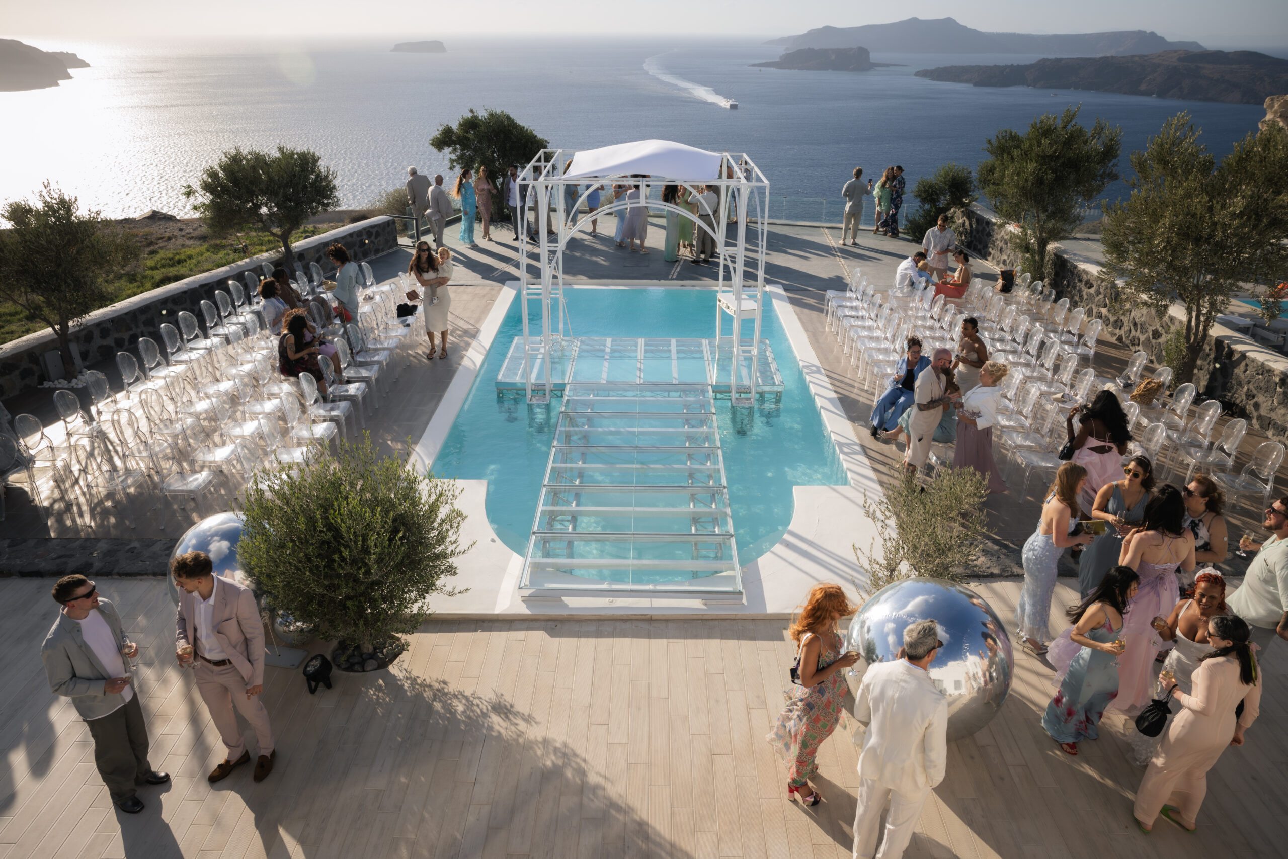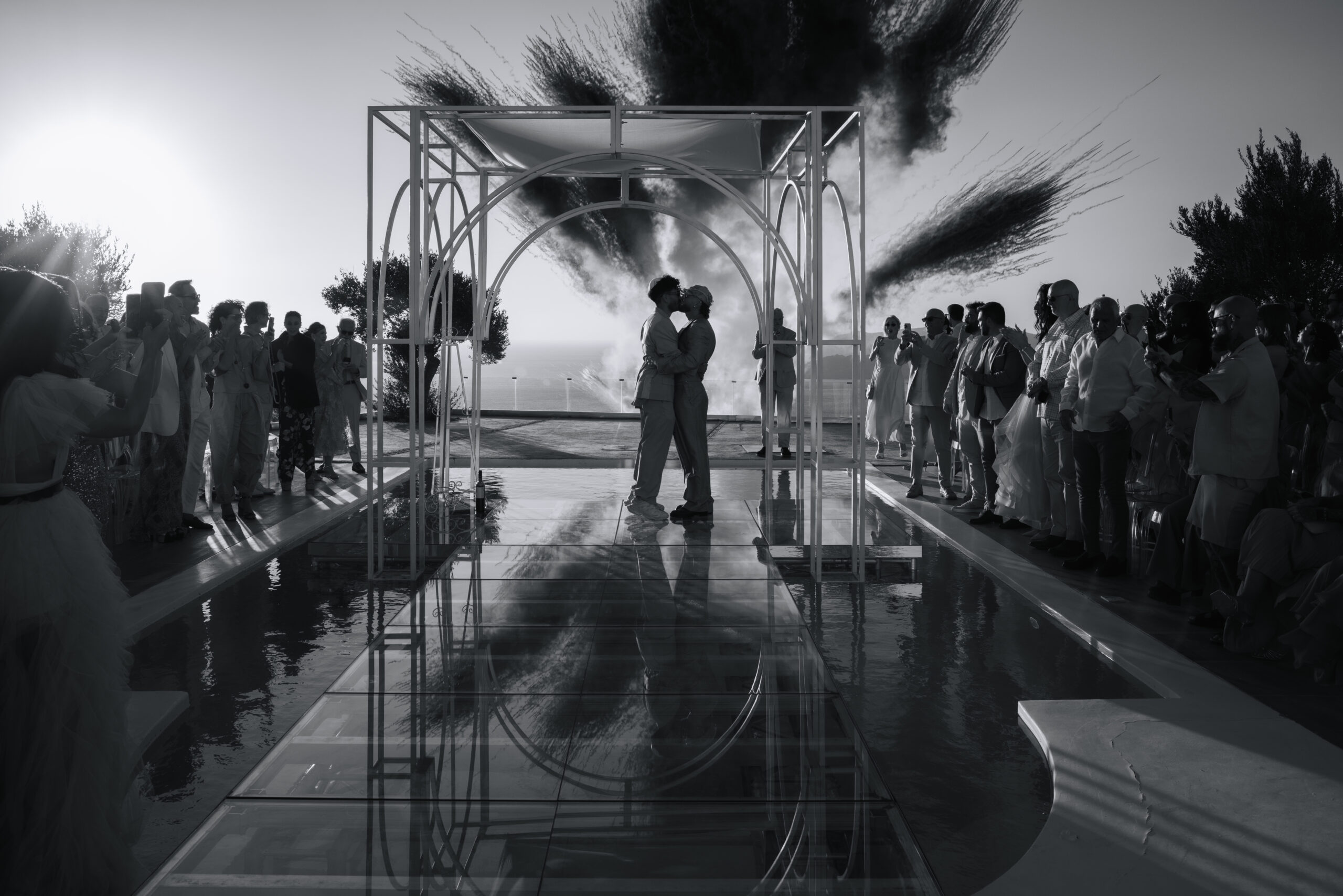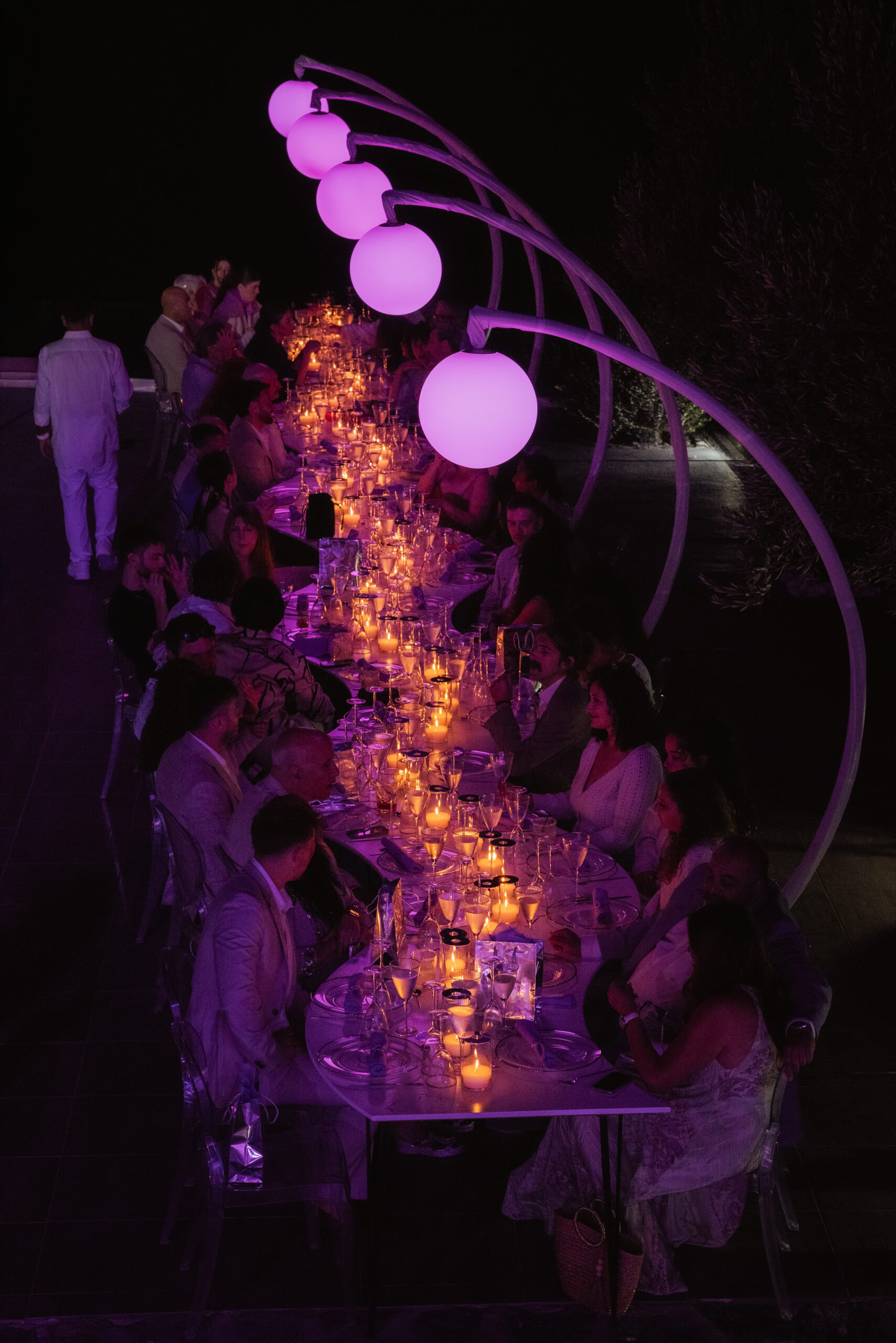 This styled setup featured an elegant dinner by the pool, complemented by a beautifully designed bridge crossing the water. Crescent stands with glowing moon elements added a celestial touch, creating a dreamy and refined evening atmosphere.