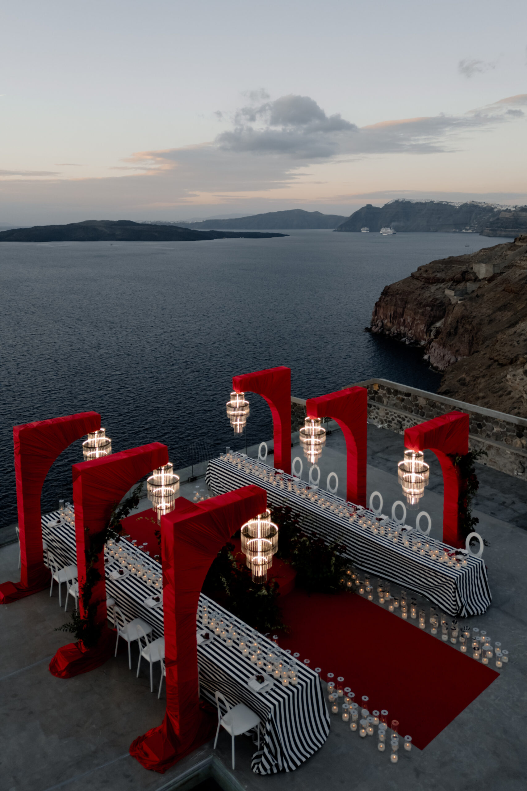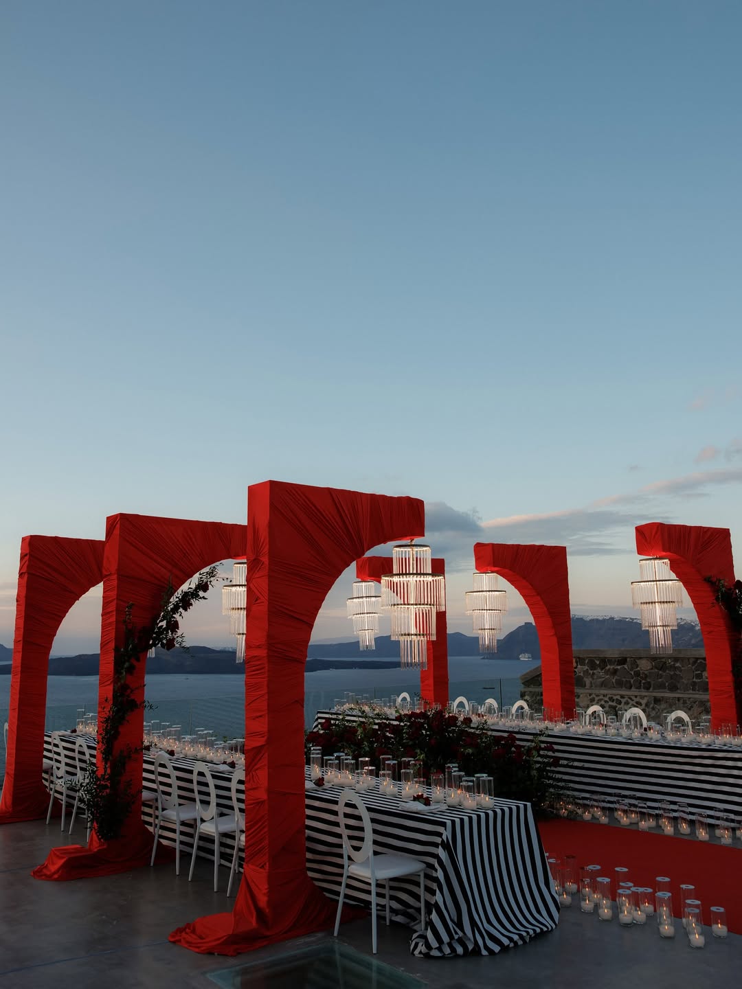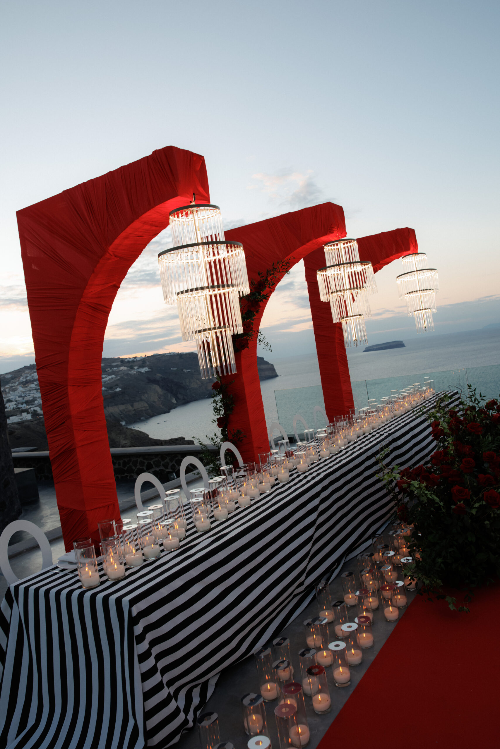 This styled dinner setting combined modern lighting with Mediterranean-inspired architecture. LED chandeliers illuminated Cycladic arches draped in rich red fabric, creating a bold and elegant atmosphere around the table.