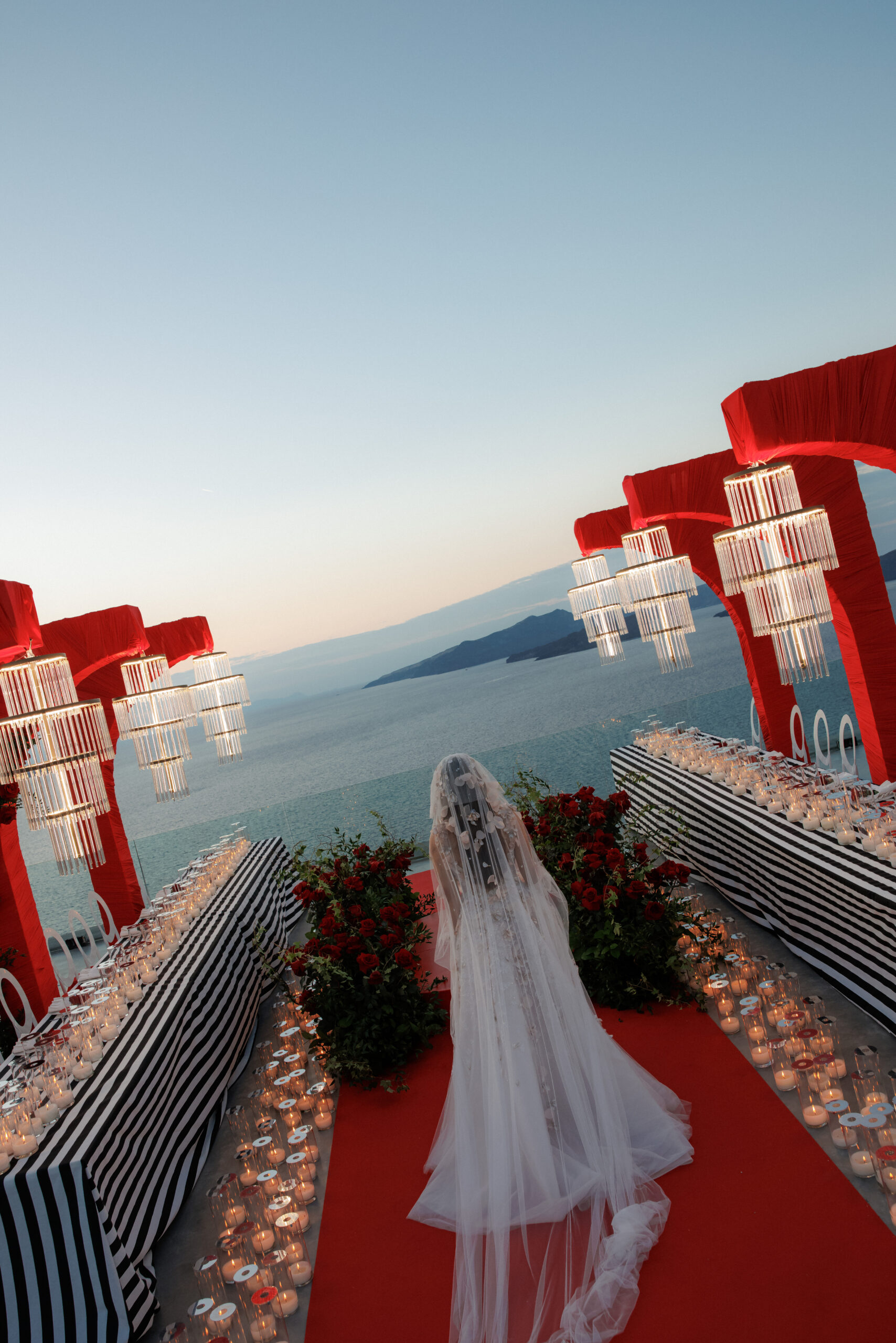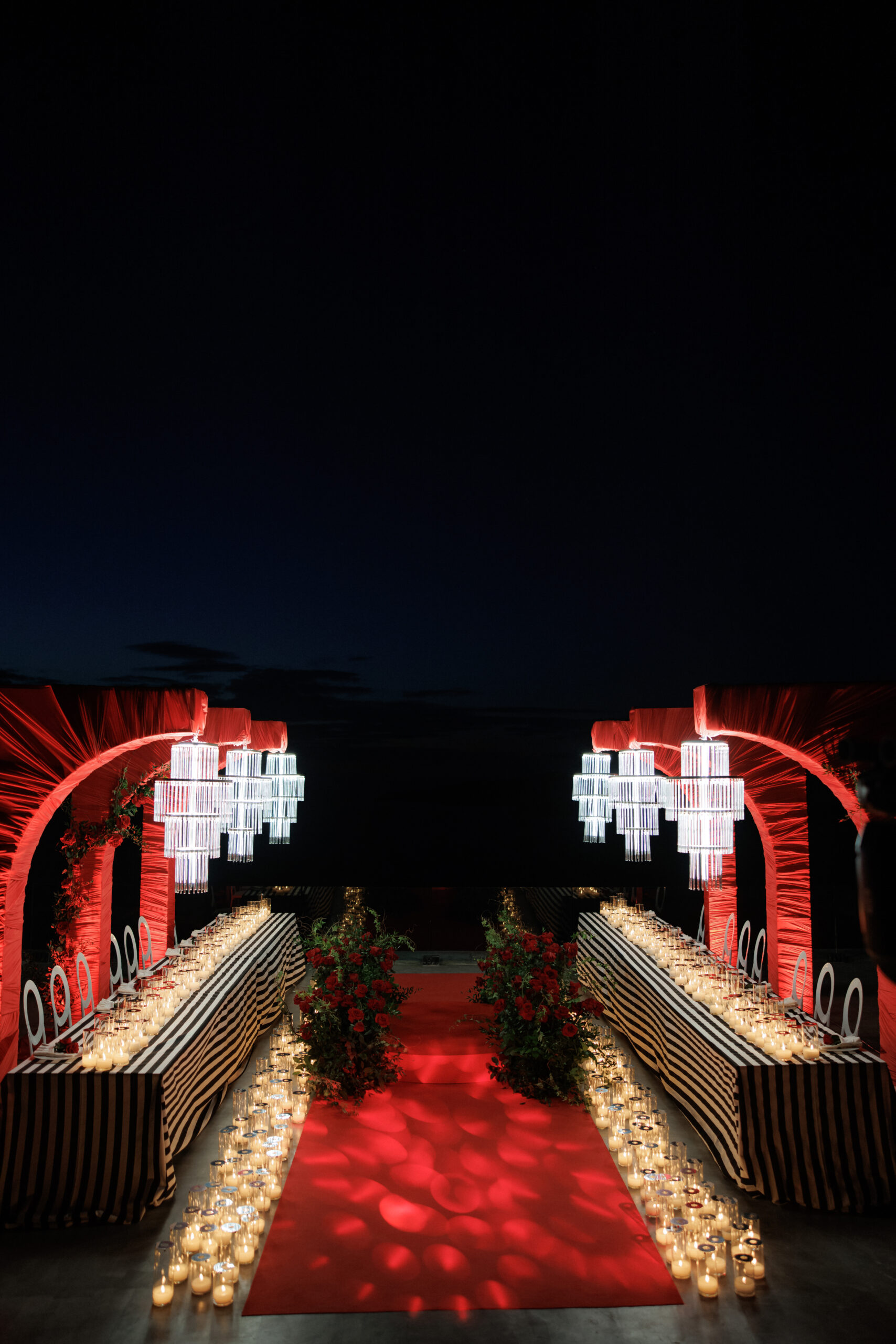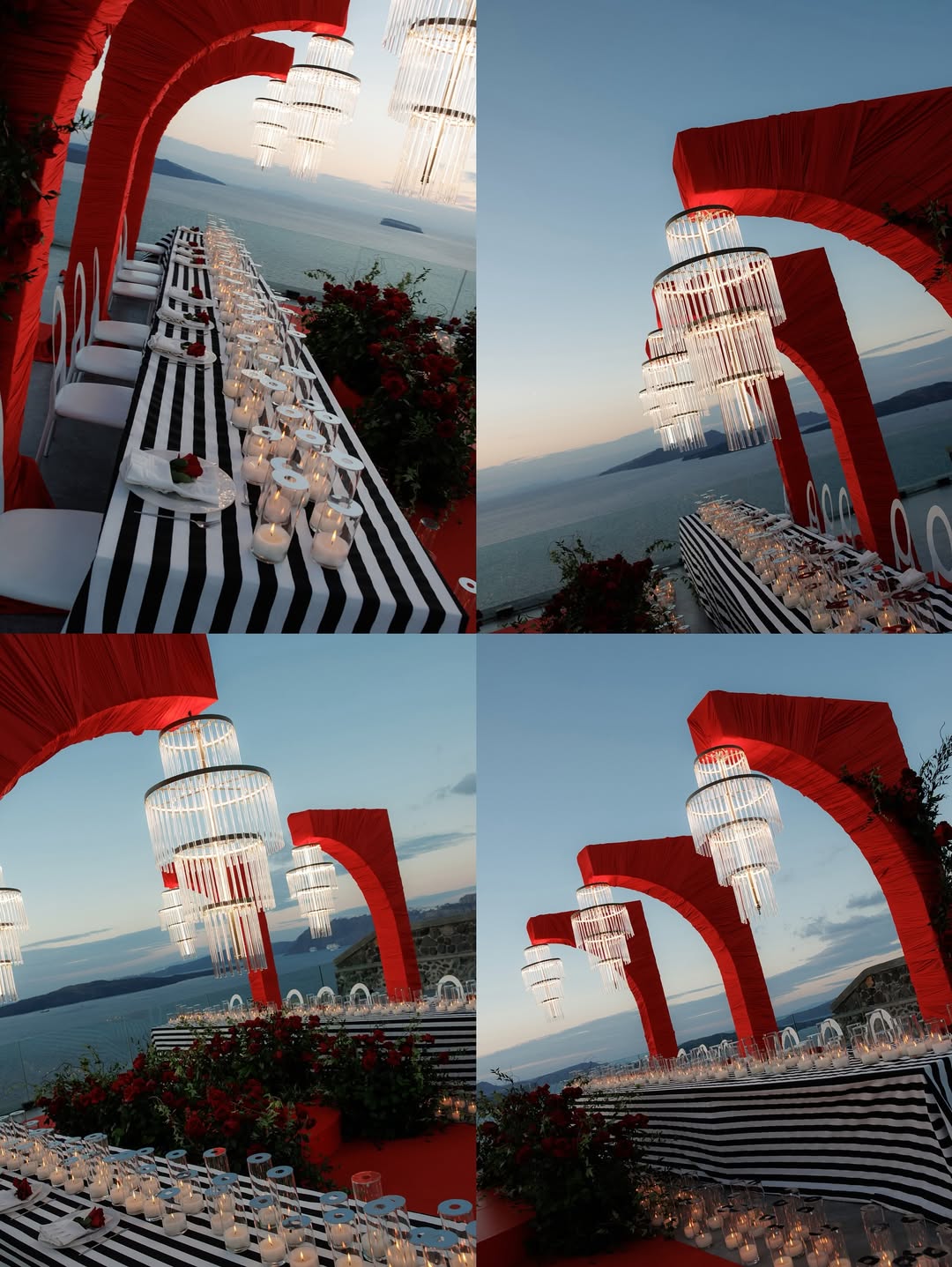 This styled dinner setting combined modern lighting with Mediterranean-inspired architecture. LED chandeliers illuminated Cycladic arches draped in rich red fabric, creating a bold and elegant atmosphere around the table.